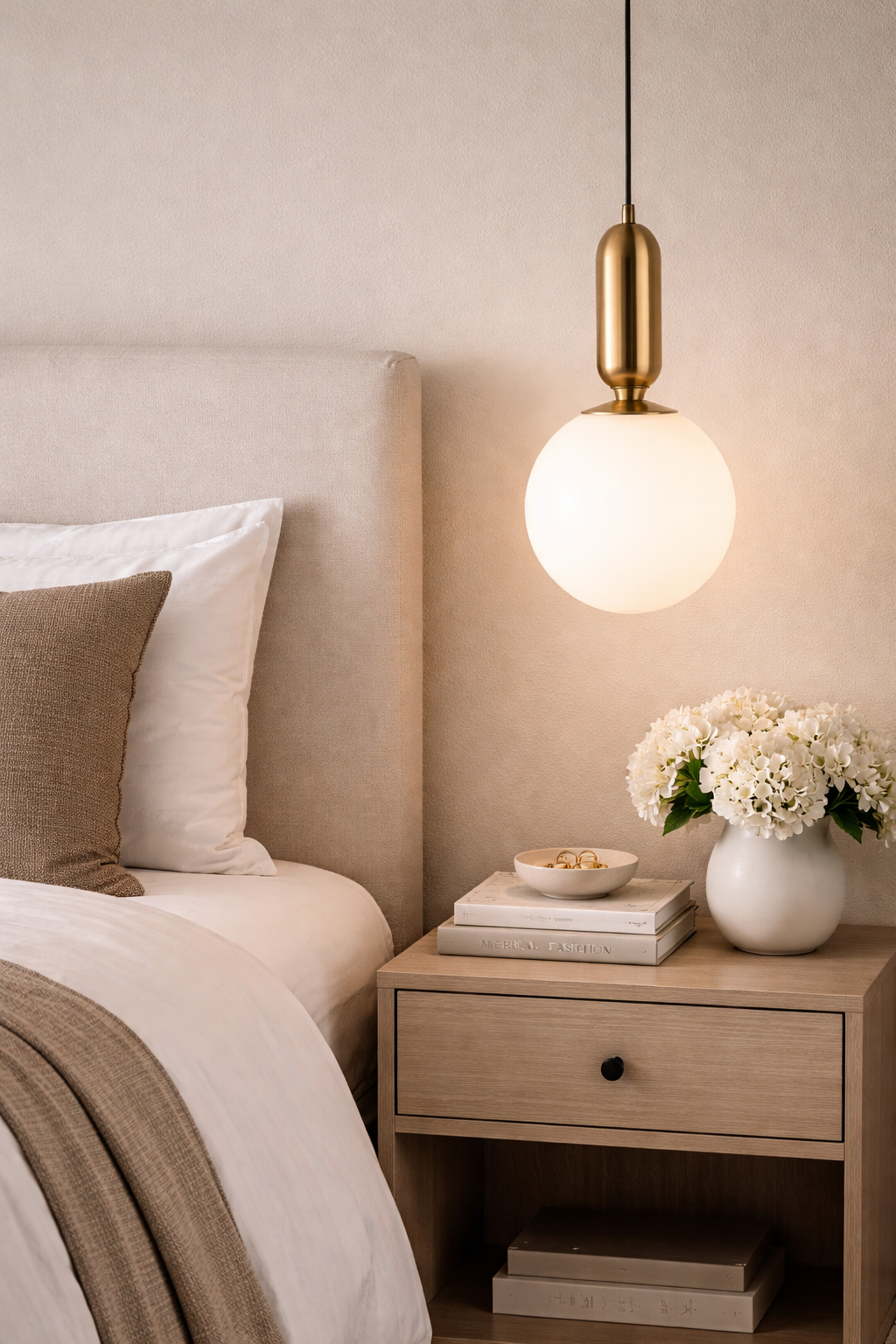 This refined pendant light pairs a smooth opal glass globe with a sculptural brass detail above, creating a beautifully balanced and elegant silhouette. The soft, diffused glow from the glass brings a warm and calming ambience, while the brass accent adds a subtle touch of luxury. Ideal for kitchen islands, dining spaces, bedside settings, or styled in clusters for entryways, it complements both contemporary and classic interiors with ease. The light enhances a space with understated sophistication, offering timeless appeal and gentle illumination.